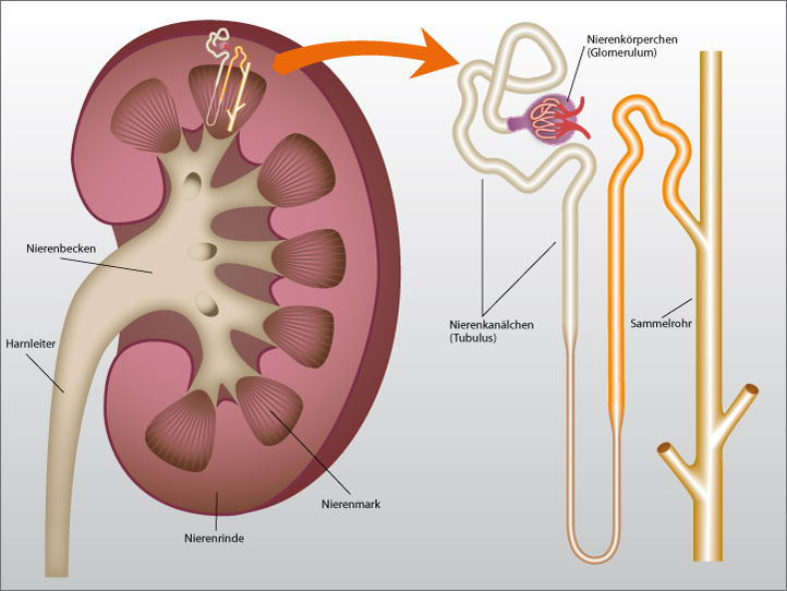 | Die linke Abbildung zeigt den Querschnitt durch eine menschliche Niere. Die Niere besteht aus 1 Million einzelner Untereinheiten, den sog. Nephronen. Ein solches Nephron ist in der linken Abbildung schematisch eingezeichnet und rechts vergrößert gezeigt. Im Nierenkörperchen entstehen am Tag 180 Liter Primärharn. Diesem Primärharn wird im Verlauf des Nierenkanälchens und im Sammelrohr das Wasser entzogen, der konzentrierte Harn fließt dann über das Nierenbecken in den Harnleiter und wird als Urin ausgeschieden. |